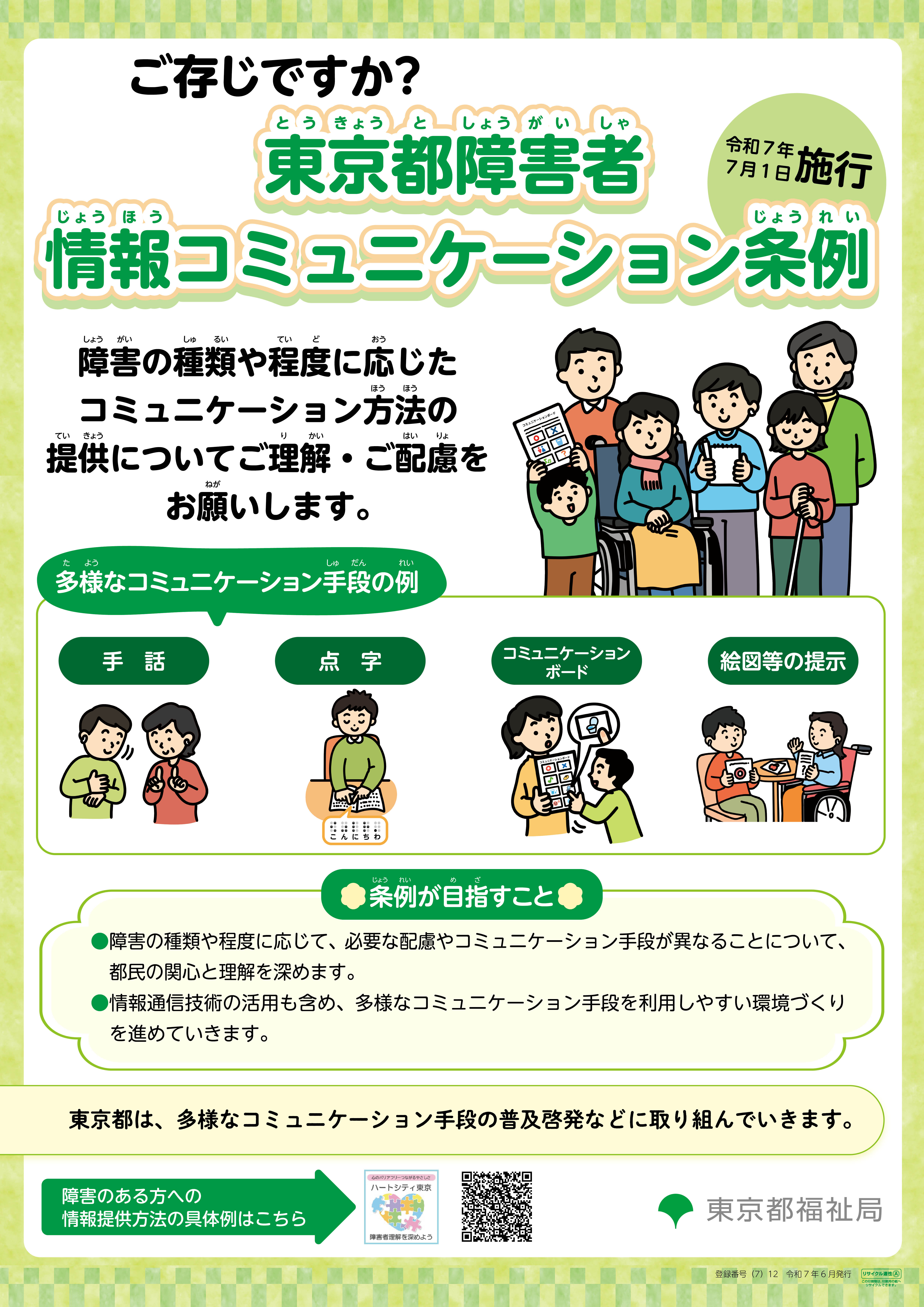 東京都では、障害の有無によって分け隔てられることなく、互いに意思を伝え、理解し、尊重し合いながら安心して生活することができる共生社会を実現するため、「東京都障害者情報コミュニケーション条例(正式名称:東京都障害者による情報の取得及び利用並びに意思疎通に係る施策の推進に関する条例)」を制定し、令和7年7月1日に施行しました。