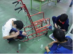 日本では1年間に約3万台以上の車いすが廃棄されていると言われている一方で、アジア諸国をはじめ海外では車いすを必要としている人がたくさんいます。そこで、世田谷泉高等学校では、生徒たちの得意な工業技術を駆使して、未舗装道路が多い国でも使いやすいパンクレスタイヤを装着して使用可能な状態に再生し、ボランティアの手を経てアジア諸国を中心に送り届けています。生徒たちは本活動を通して、社会に貢献する意識や思いやりの精神を育んでいます。