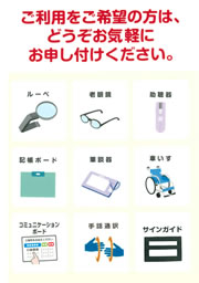 このほか、コミュニケーションボード、老眼鏡、ルーペ、サインガイド、助聴器、記帳ボード等を用意しています。これらについては、「店頭サポートグッズPRポスター」を作成し、店舗で用意のあるサポートグッズを誰にでも分かりやすいように掲示しています。
