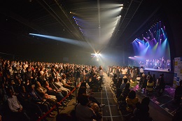 障がい者が主催するエンタテインメント事業「GCグランドフェスティバル」には、複数の著名なアーティストが出演し、障がい者が企画運営も含めた業務の約半分を担っています。障がいの有無に関わらず同じ場で働き、遊ぶことにより、それが当たり前の社会になるよう参加者への啓発を行っています。これまでに5回開催し、累計参加者数は5,800名に上ります。