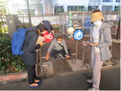 また、区内の道路調査に参加して、毎年10か所の現地調査を行い、歩道等の幅や傾斜、点字ブロックの配置状況や音声道案内の設置状況、道路の欠陥等を調べています。調査結果は行政に報告し、不具合箇所の迅速な改善等に役立てています。