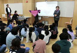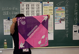 墨田区聴覚障害者協会は、小中学生を対象とした手話出前授業と災害時に役立つバンダナの作成及び普及活動を行っています。