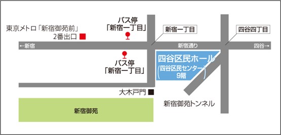 ※ 地下鉄:東京メトロ丸ノ内線 「新宿御苑前」2番出口(大木戸門)より徒歩5分